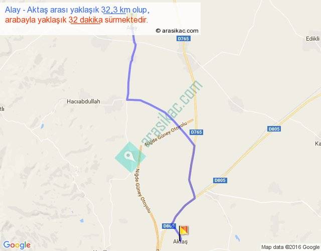Alay - Aktaş arası yaklaşık olarak 90 km/h ile yukarıda belirtilen sürede olup, iki yerin kuş uçuşu uzaklığı (mesafesi) 26'dir. Yolculuk otobüsle 41 dakika sürmektedir.