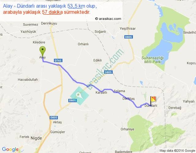 Alay - Dündarlı arası yaklaşık olarak 90 km/h ile yukarıda belirtilen sürede olup, iki yerin kuş uçuşu uzaklığı (mesafesi) 46'dir. Yolculuk otobüsle 1 saat 14 dakika sürmektedir.