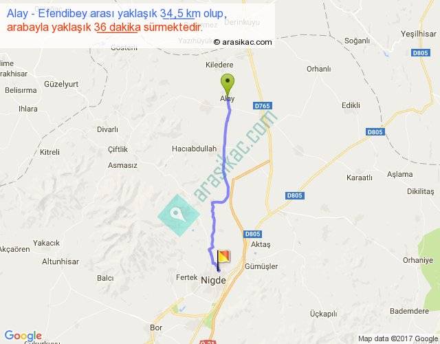 Alay - Efendibey arası yaklaşık olarak 90 km/h ile yukarıda belirtilen sürede olup, iki yerin kuş uçuşu uzaklığı (mesafesi) 30'dir. Yolculuk otobüsle 46 dakika sürmektedir.