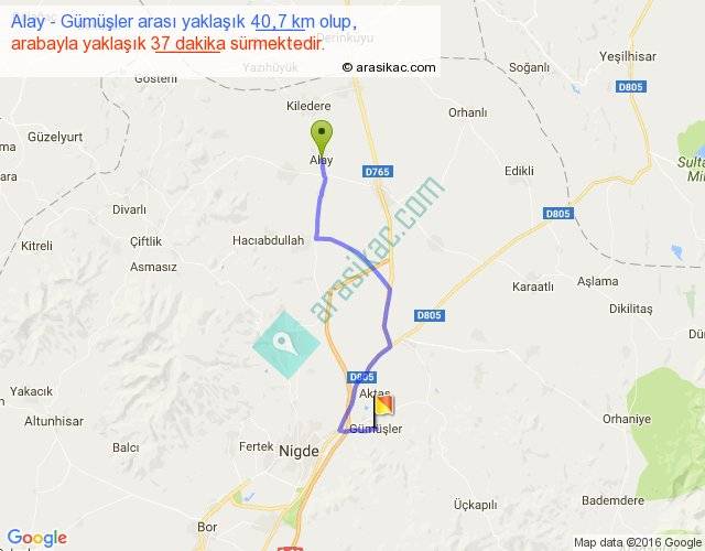 Alay - Gümüşler arası yaklaşık olarak 90 km/h ile yukarıda belirtilen sürede olup, iki yerin kuş uçuşu uzaklığı (mesafesi) 30'dir. Yolculuk otobüsle 48 dakika sürmektedir.