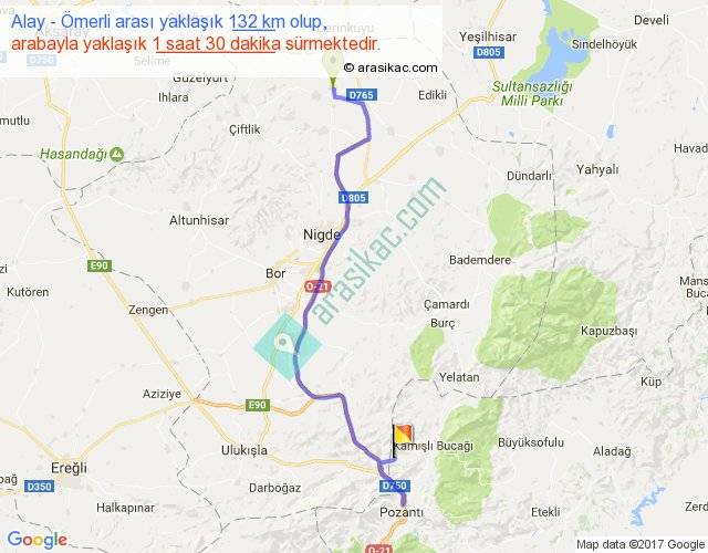 Alay - Ömerli arası yaklaşık olarak 90 km/h ile yukarıda belirtilen sürede olup, iki yerin kuş uçuşu uzaklığı (mesafesi) 81'dir. Yolculuk otobüsle 1 saat 57 dakika sürmektedir.