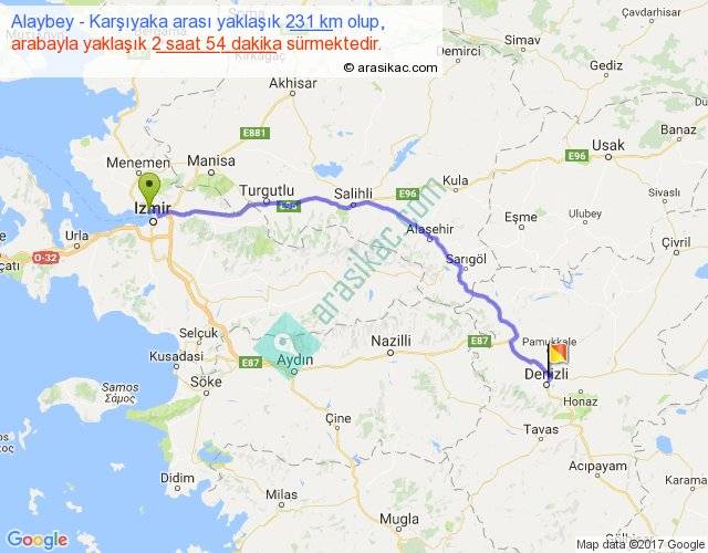 Alaybey - Karşıyaka arası yaklaşık olarak 90 km/h ile yukarıda belirtilen sürede olup, iki yerin kuş uçuşu uzaklığı (mesafesi) 187'dir. Yolculuk otobüsle 3 saat 46 dakika sürmektedir.