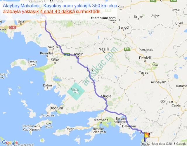 Alaybey Mahallesi - Kayaköy arası yaklaşık olarak 90 km/h ile yukarıda belirtilen sürede olup, iki yerin kuş uçuşu uzaklığı (mesafesi) 270'dir. Eğer belirtilen yerler arasında uçak seferi var ise bu süre uçakla 24 dakika'ya kadar düşebilir. Yolculuk otobüsle 6 saat 4 dakika sürmektedir.