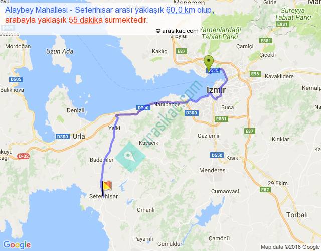 Alaybey Mahallesi - Seferihisar arası yaklaşık olarak 90 km/h ile yukarıda belirtilen sürede olup, iki yerin kuş uçuşu uzaklığı (mesafesi) 38'dir. Yolculuk otobüsle 1 saat 11 dakika sürmektedir.