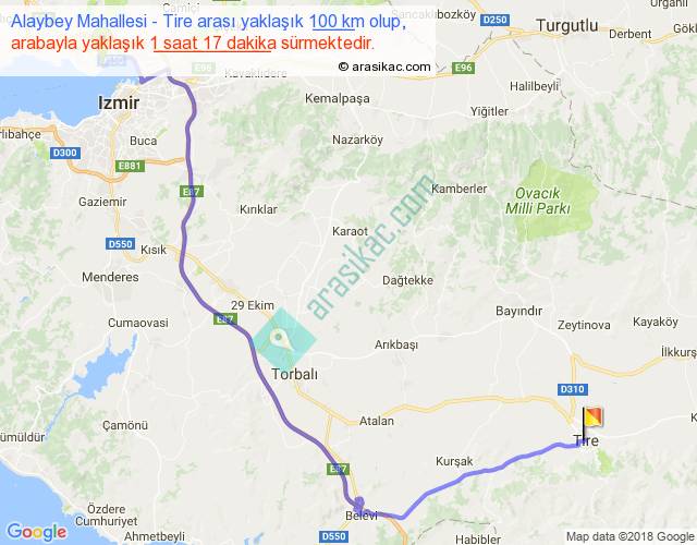 Alaybey Mahallesi - Tire arası yaklaşık olarak 90 km/h ile yukarıda belirtilen sürede olup, iki yerin kuş uçuşu uzaklığı (mesafesi) 67'dir. Yolculuk otobüsle 1 saat 40 dakika sürmektedir.