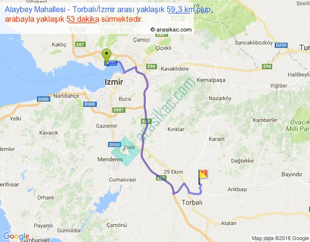 Alaybey Mahallesi - Torbalı İzmir arası yaklaşık olarak 90 km/h ile yukarıda belirtilen sürede olup, iki yerin kuş uçuşu uzaklığı (mesafesi) 37'dir. Yolculuk otobüsle 1 saat 8 dakika sürmektedir.