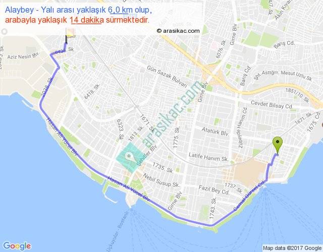 Alaybey - Yalı arası yaklaşık olarak 90 km/h ile yukarıda belirtilen sürede olup, iki yerin kuş uçuşu uzaklığı (mesafesi) 4'dir. Yolculuk otobüsle 18 dakika sürmektedir.