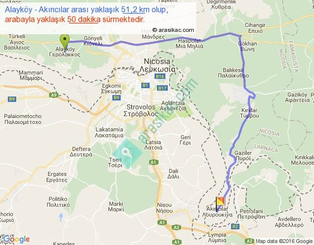 Alayköy - Akıncılar arası yaklaşık olarak 90 km/h ile yukarıda belirtilen sürede olup, iki yerin kuş uçuşu uzaklığı (mesafesi) 28'dir. Yolculuk otobüsle 1 saat 5 dakika sürmektedir.