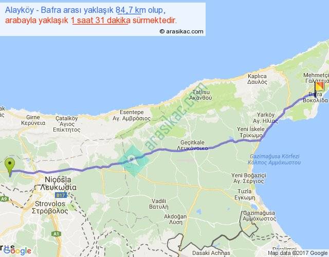 Alayköy - Bafra arası yaklaşık olarak 90 km/h ile yukarıda belirtilen sürede olup, iki yerin kuş uçuşu uzaklığı (mesafesi) 76'dir. Yolculuk otobüsle 1 saat 58 dakika sürmektedir.