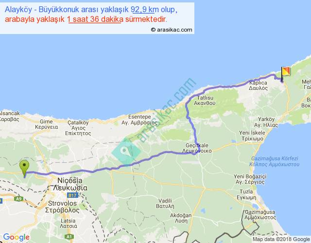 Alayköy - Büyükkonuk arası yaklaşık olarak 90 km/h ile yukarıda belirtilen sürede olup, iki yerin kuş uçuşu uzaklığı (mesafesi) 70'dir. Yolculuk otobüsle 2 saat 4 dakika sürmektedir.