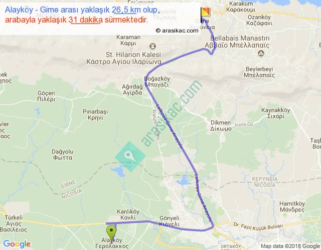 Alayköy - Girne arası yaklaşık olarak 90 km/h ile yukarıda belirtilen sürede olup, iki yerin kuş uçuşu uzaklığı (mesafesi) 15'dir. Yolculuk otobüsle 40 dakika sürmektedir.