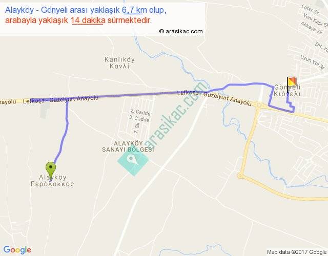 Alayköy - Gönyeli arası yaklaşık olarak 90 km/h ile yukarıda belirtilen sürede olup, iki yerin kuş uçuşu uzaklığı (mesafesi) 4'dir. Yolculuk otobüsle 18 dakika sürmektedir.