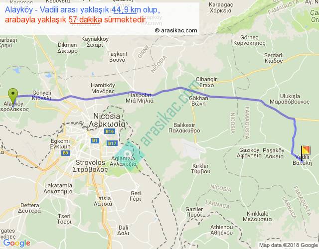 Alayköy - Vadili arası yaklaşık olarak 90 km/h ile yukarıda belirtilen sürede olup, iki yerin kuş uçuşu uzaklığı (mesafesi) 37'dir. Yolculuk otobüsle 1 saat 14 dakika sürmektedir.