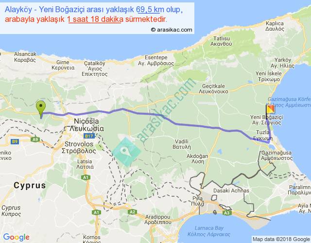 Alayköy - Yeni Boğaziçi arası yaklaşık olarak 90 km/h ile yukarıda belirtilen sürede olup, iki yerin kuş uçuşu uzaklığı (mesafesi) 58'dir. Yolculuk otobüsle 1 saat 41 dakika sürmektedir.