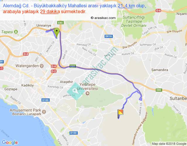 Alemdağ Cd. - Büyükbakkalköy Mahallesi arası yaklaşık olarak 90 km/h ile yukarıda belirtilen sürede olup, iki yerin kuş uçuşu uzaklığı (mesafesi) 10'dir. Yolculuk otobüsle 37 dakika sürmektedir.