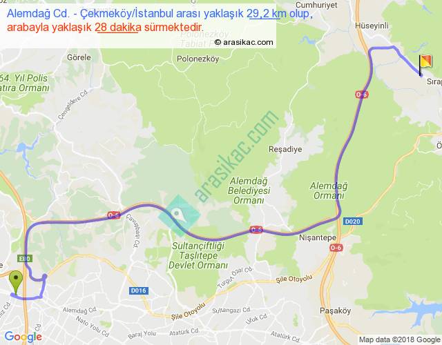 Alemdağ Cd. - Çekmeköy İstanbul arası yaklaşık olarak 90 km/h ile yukarıda belirtilen sürede olup, iki yerin kuş uçuşu uzaklığı (mesafesi) 19'dir. Yolculuk otobüsle 36 dakika sürmektedir.