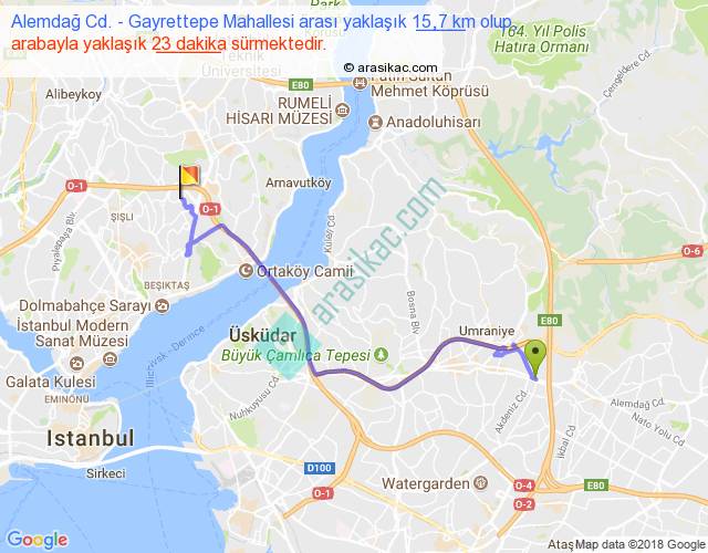 Alemdağ Cd. - Gayrettepe Mahallesi arası yaklaşık olarak 90 km/h ile yukarıda belirtilen sürede olup, iki yerin kuş uçuşu uzaklığı (mesafesi) 10'dir. Yolculuk otobüsle 29 dakika sürmektedir.