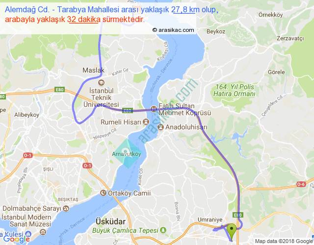 Alemdağ Cd. - Tarabya Mahallesi arası yaklaşık olarak 90 km/h ile yukarıda belirtilen sürede olup, iki yerin kuş uçuşu uzaklığı (mesafesi) 14'dir. Yolculuk otobüsle 41 dakika sürmektedir.
