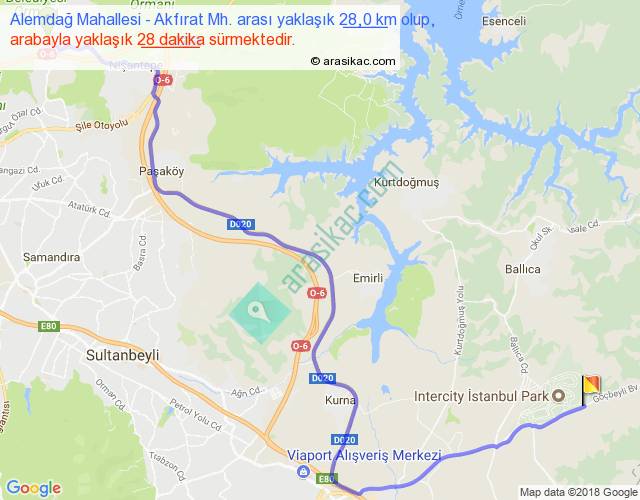 Alemdağ Mahallesi - Akfırat Mh. arası yaklaşık olarak 90 km/h ile yukarıda belirtilen sürede olup, iki yerin kuş uçuşu uzaklığı (mesafesi) 19'dir. Yolculuk otobüsle 36 dakika sürmektedir.