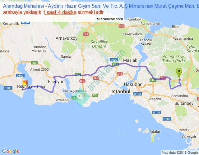 Alemdağ Mahallesi - Aydınlı Hazır Giyim San. Ve Tic. A.Ş Mimarsinan Murat Çeşme Mah. E-5 arası yaklaşık olarak 90 km/h ile yukarıda belirtilen sürede olup, iki yerin kuş uçuşu uzaklığı (mesafesi) 58'dir. Yolculuk otobüsle 1 saat 23 dakika sürmektedir.