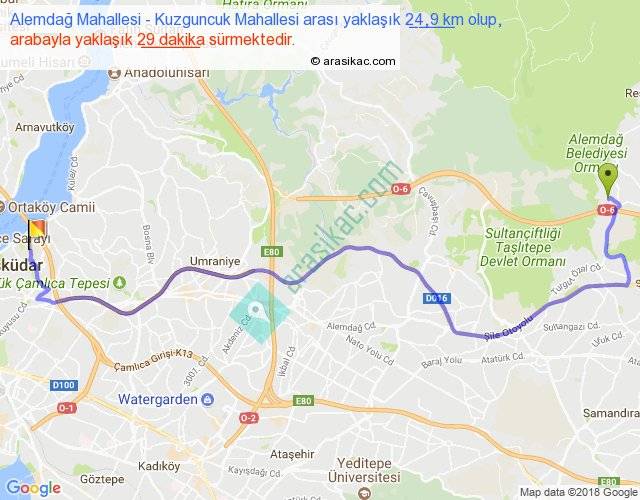 Alemdağ Mahallesi - Kuzguncuk Mahallesi arası yaklaşık olarak 90 km/h ile yukarıda belirtilen sürede olup, iki yerin kuş uçuşu uzaklığı (mesafesi) 17'dir. Yolculuk otobüsle 37 dakika sürmektedir.