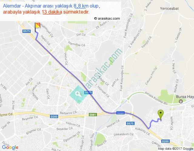 Alemdar - Akpınar arası yaklaşık olarak 90 km/h ile yukarıda belirtilen sürede olup, iki yerin kuş uçuşu uzaklığı (mesafesi) 7'dir. Yolculuk otobüsle 16 dakika sürmektedir.