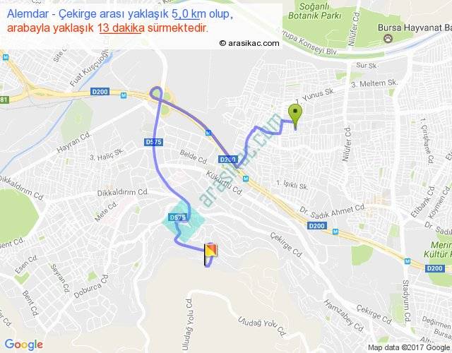 Alemdar - Çekirge arası yaklaşık olarak 90 km/h ile yukarıda belirtilen sürede olup, iki yerin kuş uçuşu uzaklığı (mesafesi) 2'dir. Yolculuk otobüsle 16 dakika sürmektedir.