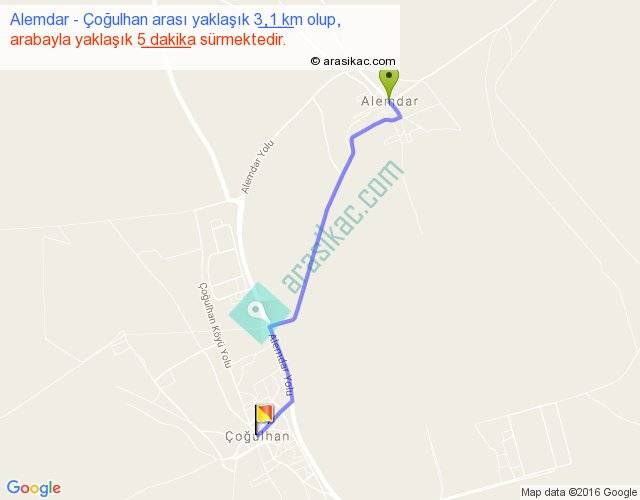 Alemdar - Çoğulhan arası yaklaşık olarak 90 km/h ile yukarıda belirtilen sürede olup, iki yerin kuş uçuşu uzaklığı (mesafesi) 3'dir. Yolculuk otobüsle 6 dakika sürmektedir.