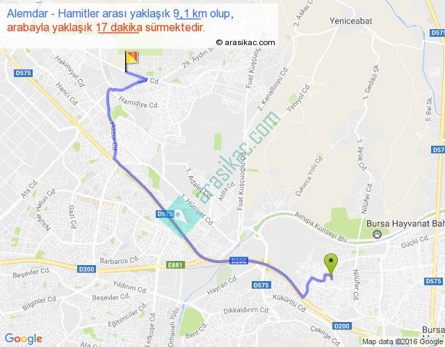 Alemdar - Hamitler arası yaklaşık olarak 90 km/h ile yukarıda belirtilen sürede olup, iki yerin kuş uçuşu uzaklığı (mesafesi) 6'dir. Yolculuk otobüsle 22 dakika sürmektedir.