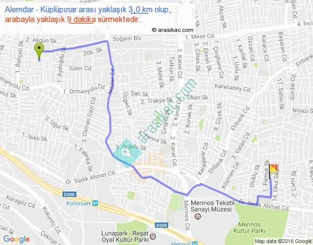 Alemdar - Küplüpınar arası yaklaşık olarak 90 km/h ile yukarıda belirtilen sürede olup, iki yerin kuş uçuşu uzaklığı (mesafesi) 2'dir. Yolculuk otobüsle 11 dakika sürmektedir.