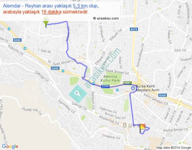 Alemdar - Reyhan arası yaklaşık olarak 90 km/h ile yukarıda belirtilen sürede olup, iki yerin kuş uçuşu uzaklığı (mesafesi) 3'dir. Yolculuk otobüsle 20 dakika sürmektedir.