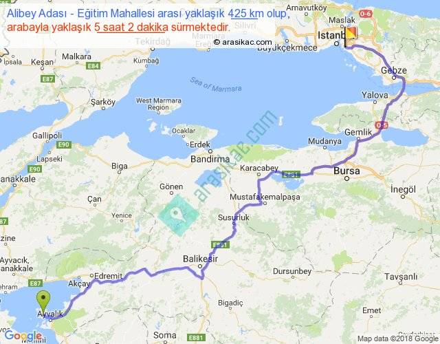 Alibey Adası - Eğitim Mahallesi arası yaklaşık olarak 90 km/h ile yukarıda belirtilen sürede olup, iki yerin kuş uçuşu uzaklığı (mesafesi) 273'dir. Eğer belirtilen yerler arasında uçak seferi var ise bu süre uçakla 25 dakika'ya kadar düşebilir. Yolculuk otobüsle 6 saat 32 dakika sürmektedir.