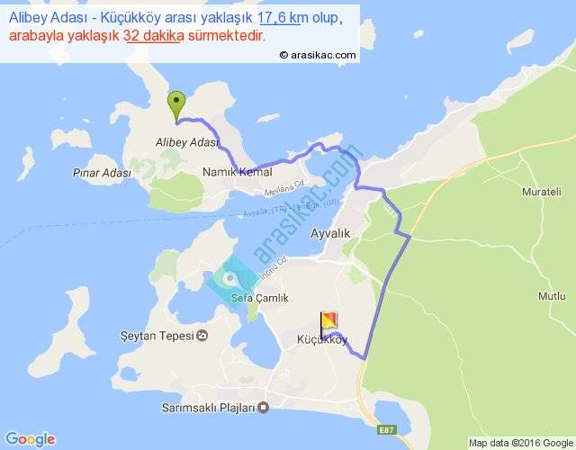 Alibey Adası - Küçükköy arası yaklaşık olarak 90 km/h ile yukarıda belirtilen sürede olup, iki yerin kuş uçuşu uzaklığı (mesafesi) 8'dir. Yolculuk otobüsle 41 dakika sürmektedir.
