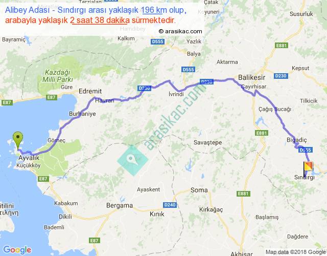 Alibey Adası - Sındırgı arası yaklaşık olarak 90 km/h ile yukarıda belirtilen sürede olup, iki yerin kuş uçuşu uzaklığı (mesafesi) 132'dir. Yolculuk otobüsle 3 saat 25 dakika sürmektedir.