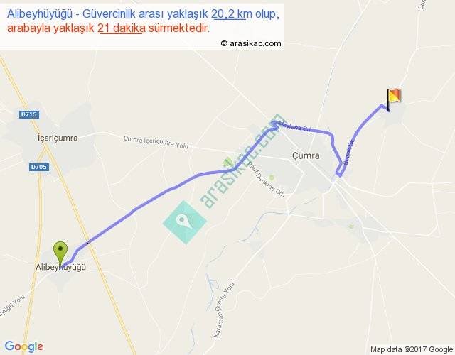 Alibeyhüyüğü - Güvercinlik arası yaklaşık olarak 90 km/h ile yukarıda belirtilen sürede olup, iki yerin kuş uçuşu uzaklığı (mesafesi) 15'dir. Yolculuk otobüsle 27 dakika sürmektedir.
