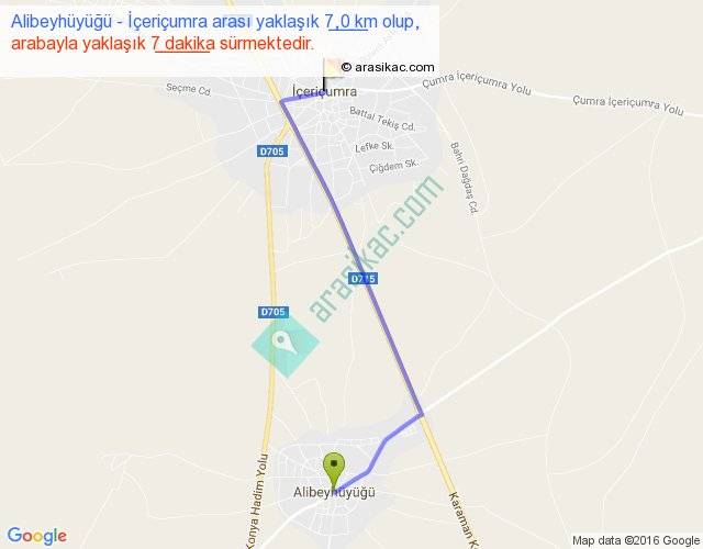 Alibeyhüyüğü - İçeriçumra arası yaklaşık olarak 90 km/h ile yukarıda belirtilen sürede olup, iki yerin kuş uçuşu uzaklığı (mesafesi) 5'dir. Yolculuk otobüsle 9 dakika sürmektedir.