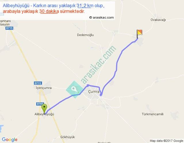 Alibeyhüyüğü - Karkın arası yaklaşık olarak 90 km/h ile yukarıda belirtilen sürede olup, iki yerin kuş uçuşu uzaklığı (mesafesi) 25'dir. Yolculuk otobüsle 39 dakika sürmektedir.