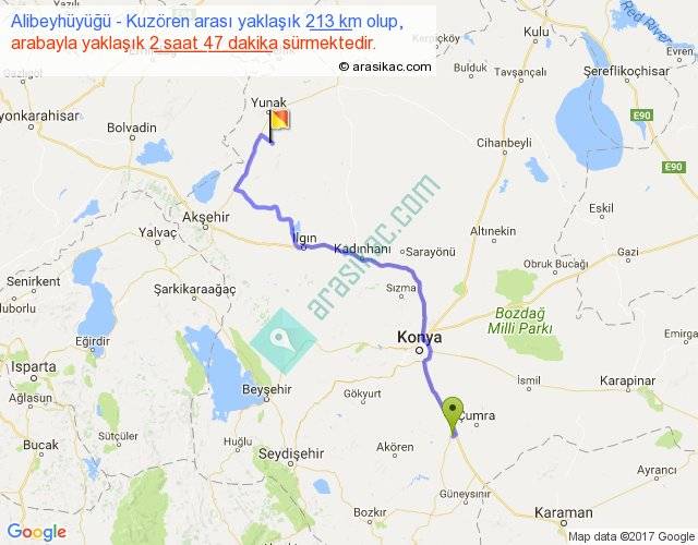 Alibeyhüyüğü - Kuzören arası yaklaşık olarak 90 km/h ile yukarıda belirtilen sürede olup, iki yerin kuş uçuşu uzaklığı (mesafesi) 151'dir. Yolculuk otobüsle 3 saat 37 dakika sürmektedir.
