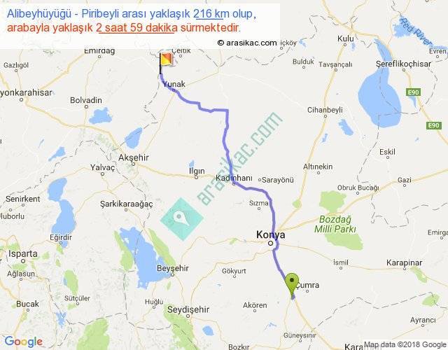 Alibeyhüyüğü - Piribeyli arası yaklaşık olarak 90 km/h ile yukarıda belirtilen sürede olup, iki yerin kuş uçuşu uzaklığı (mesafesi) 177'dir. Yolculuk otobüsle 3 saat 52 dakika sürmektedir.