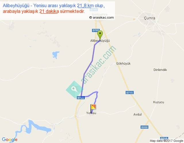 Alibeyhüyüğü - Yenisu arası yaklaşık olarak 90 km/h ile yukarıda belirtilen sürede olup, iki yerin kuş uçuşu uzaklığı (mesafesi) 15'dir. Yolculuk otobüsle 27 dakika sürmektedir.