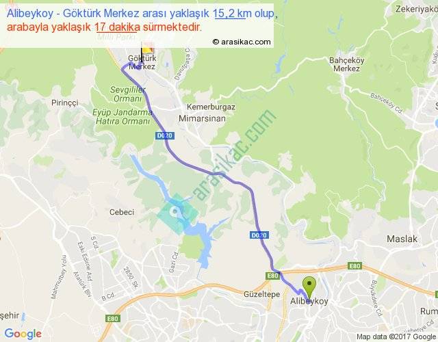 Alibeykoy - Göktürk Merkez arası yaklaşık olarak 90 km/h ile yukarıda belirtilen sürede olup, iki yerin kuş uçuşu uzaklığı (mesafesi) 12'dir. Yolculuk otobüsle 22 dakika sürmektedir.