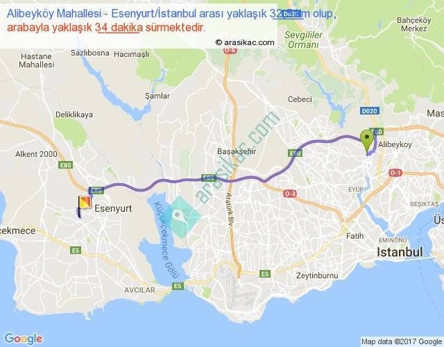 Alibeyköy Mahallesi - Esenyurt İstanbul arası yaklaşık olarak 90 km/h ile yukarıda belirtilen sürede olup, iki yerin kuş uçuşu uzaklığı (mesafesi) 24'dir. Yolculuk otobüsle 44 dakika sürmektedir.