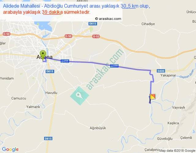 Alidede Mahallesi - Abdioğlu Cumhuriyet arası yaklaşık olarak 90 km/h ile yukarıda belirtilen sürede olup, iki yerin kuş uçuşu uzaklığı (mesafesi) 23'dir. Yolculuk otobüsle 50 dakika sürmektedir.