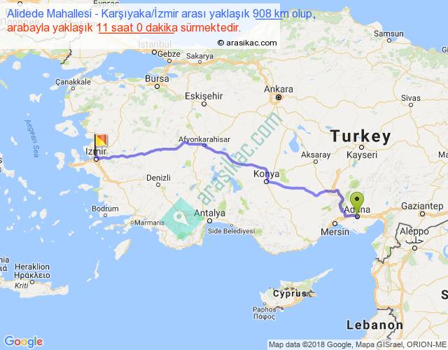 Alidede Mahallesi - Karşıyaka İzmir arası yaklaşık olarak 90 km/h ile yukarıda belirtilen sürede olup, iki yerin kuş uçuşu uzaklığı (mesafesi) 735'dir. Eğer belirtilen yerler arasında uçak seferi var ise bu süre uçakla 1 saat 07 dakika'ya kadar düşebilir. Yolculuk otobüsle 14 saat 18 dakika sürmektedir.