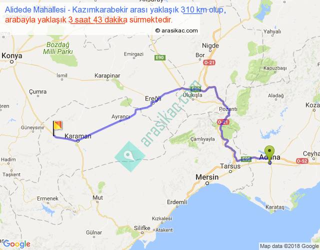 Alidede Mahallesi - Kazımkarabekir arası yaklaşık olarak 90 km/h ile yukarıda belirtilen sürede olup, iki yerin kuş uçuşu uzaklığı (mesafesi) 211'dir. Yolculuk otobüsle 4 saat 49 dakika sürmektedir.
