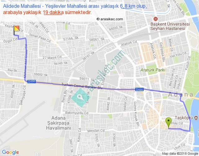 Alidede Mahallesi - Yeşilevler Mahallesi arası yaklaşık olarak 90 km/h ile yukarıda belirtilen sürede olup, iki yerin kuş uçuşu uzaklığı (mesafesi) 4'dir. Yolculuk otobüsle 24 dakika sürmektedir.