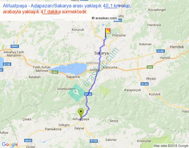 Alifuatpaşa - Adapazarı Sakarya arası yaklaşık olarak 90 km/h ile yukarıda belirtilen sürede olup, iki yerin kuş uçuşu uzaklığı (mesafesi) 33'dir. Yolculuk otobüsle 1 saat 1 dakika sürmektedir.