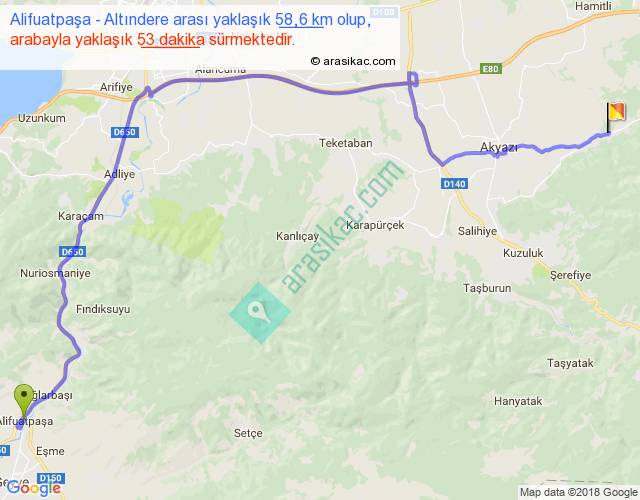 Alifuatpaşa - Altındere arası yaklaşık olarak 90 km/h ile yukarıda belirtilen sürede olup, iki yerin kuş uçuşu uzaklığı (mesafesi) 38'dir. Yolculuk otobüsle 1 saat 8 dakika sürmektedir.