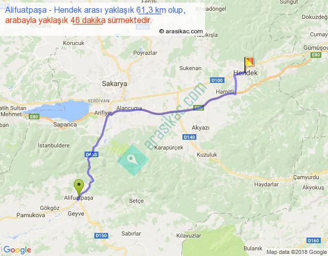 Alifuatpaşa - Hendek arası yaklaşık olarak 90 km/h ile yukarıda belirtilen sürede olup, iki yerin kuş uçuşu uzaklığı (mesafesi) 47'dir. Yolculuk otobüsle 59 dakika sürmektedir.