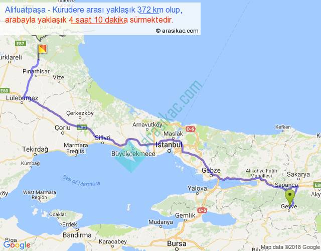 Alifuatpaşa - Kurudere arası yaklaşık olarak 90 km/h ile yukarıda belirtilen sürede olup, iki yerin kuş uçuşu uzaklığı (mesafesi) 265'dir. Eğer belirtilen yerler arasında uçak seferi var ise bu süre uçakla 24 dakika'ya kadar düşebilir. Yolculuk otobüsle 5 saat 25 dakika sürmektedir.